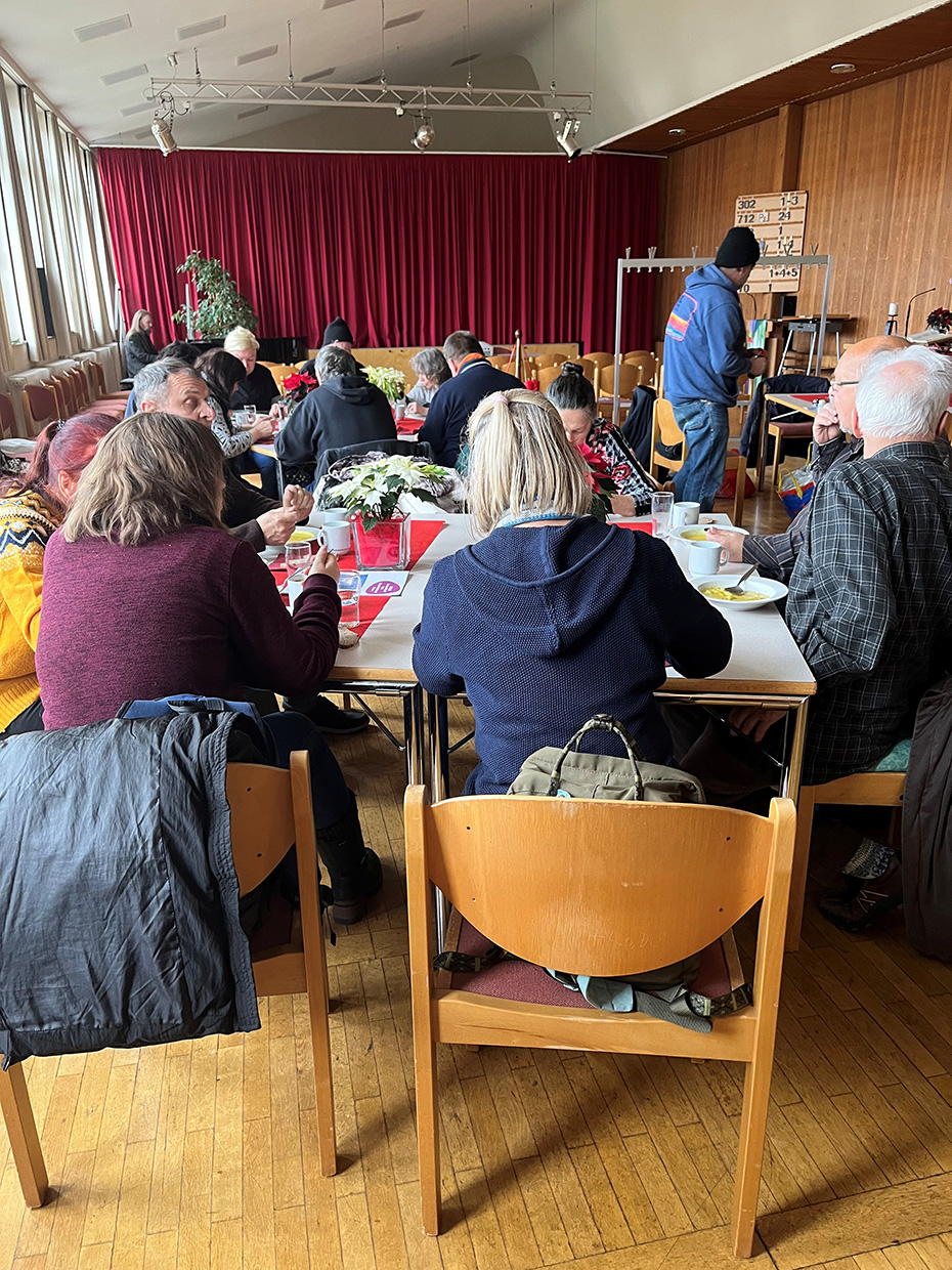 (EG) Ausnahmsweise fand die Suppenküche im Stephanusgemeindehaus am ersten Samstag des Monats – am 6. Dezember 2025 – statt. Eine herzhafte Kürbissuppe – auf Wunsch auch mit Hackfleisch – wurde angeboten. Danach gab es das sehr beliebte Apfelmus-Tiramisu. Das gemütliche Kaffeetrinken anschließend wurde mit verschiedenen Kuchen ansprechend angeboten.